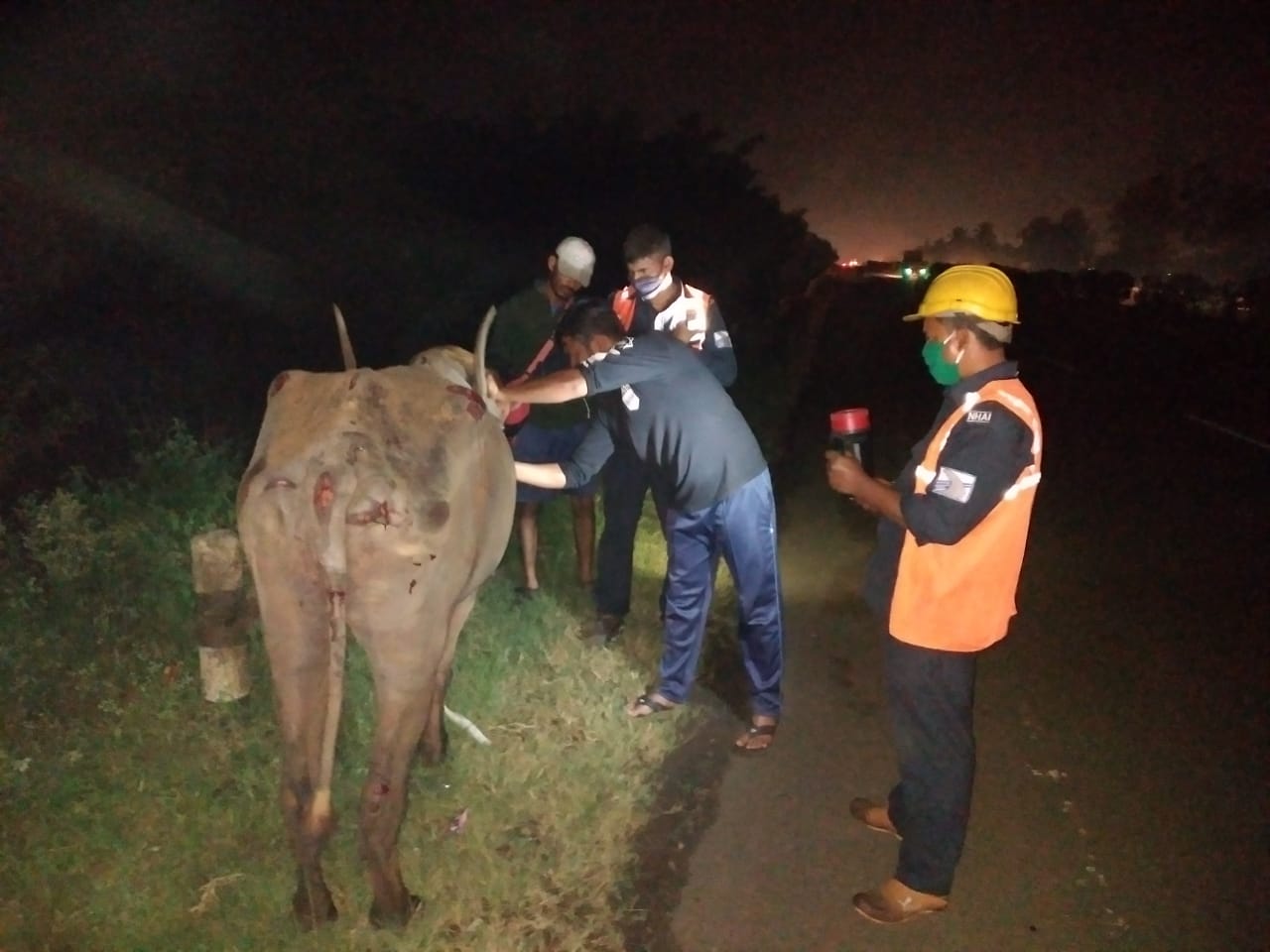 बेळगाव शहरानजीकच्या राष्ट्रीय महामार्ग क्रमांक 4 वर रस्ता ओलांडताना भरधाव वाहनांच्या नोकरीने मोकाट जनावरे मृत्युमुखी तर पडत आहेतच शिवाय प्रवाशांचा जीव देखील धोक्यात येत आहे. याला आळा घालण्यासाठी शहरानजीक महामार्गाच्या दुतर्फा बॅरिकेड्स घालण्यात यावेत अशी मागणी गेल्या अनेक महिन्यांपासून केली जात आहे. तथापि राष्ट्रीय महामार्ग खात्यासह संबंधितांचे याकडे साफ दुर्लक्ष होत आहे. त्यामुळे भरधाव वाहनांच्या ठोकरीने जनावरे मृत्युमुखी पडण्याचे अथवा गंभीर जखमी होण्याचे सत्र सुरूच आहे. अपघाती मृत्युमुखी पडलेले जनावर अथवा जखमी झालेल्या जनावरांचा प्रश्न मार्गी लावण्यासाठी राष्ट्रीय महामार्गावरील गस्ती पथक सातत्याने काकती येथील “हा माझा धर्म” या प्राणी दया व सेवाभावी संघटनांचे सहकार्य घेत असते. गस्ती पथकाकडून बोलावणे येताच या संघटनेचे प्रमुख विनायक केसरकर हे हातातील काम सोडून वेळी-अवेळी महामार्ग गस्ती पथकाच्या मदतीला धावून जात असतात.
