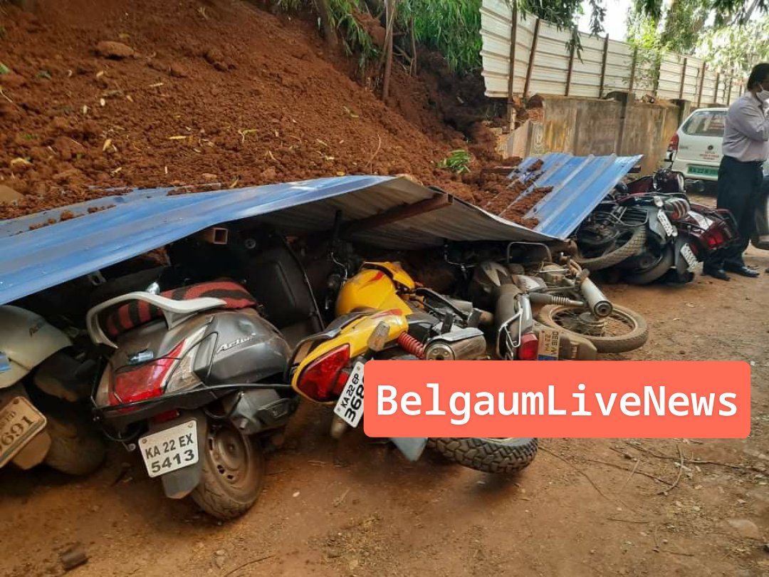 टिळकवाडी येथील कला मंदिरच्या ठिकाणी स्मार्ट सिटी योजनेअंतर्गत भव्य संकुल उभारले जाणार आहे. या संकुलाचे बांधकाम सध्या सुरू आपल्यामुळे या जागेच्या चारही बाजूला उंच पत्रे मारून आडोसा निर्माण करण्यात आला आहे. या पत्रांना लागून आतल्या बाजूला खणण्यात आलेल्या दगडमातीचा ढिगारा टाकण्यात येत होता. एके ठिकाणी इतक्या मोठ्या प्रमाणात दगडमातीचा ढिगारा टाकण्यात आला होता की त्याचा भार न पेलल्याने आज दुपारी चारच्या सुमारास आडोशाचे पत्रे उन्मळून तो ढिगारा बाहेरील बाजूस रस्त्याच्या कडेला पार्क केलेल्या 12 दुचाकींवर कोसळला.