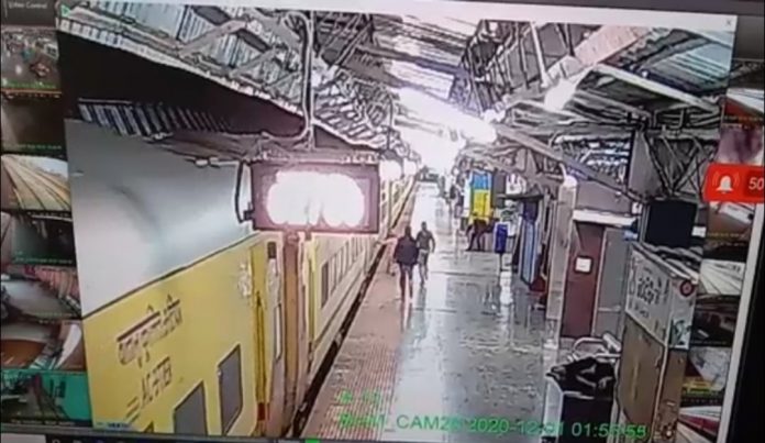बेळगांव रेल्वे स्थानकावर हे का होमगार्ड व पोलिसाने दाखवलेल्या प्रसंगावधानामुळे चालत्या रेल्वेतून उतरून पुन्हा चढण्याचा प्रयत्न करणाऱ्या एका चिमुकलीचा जीव वाचल्याची थरारक घटना गेल्या 1 डिसेंबर रोजी मध्यरात्री घडली. रेल्वे स्टेशनवरील सीसी टीव्हीमध्ये कैद झालेल्या काळजाचा ठोका चुकविणाऱ्या या प्रसंगाचा व्हिडिओ सध्या व्हायरल झाला आहे.