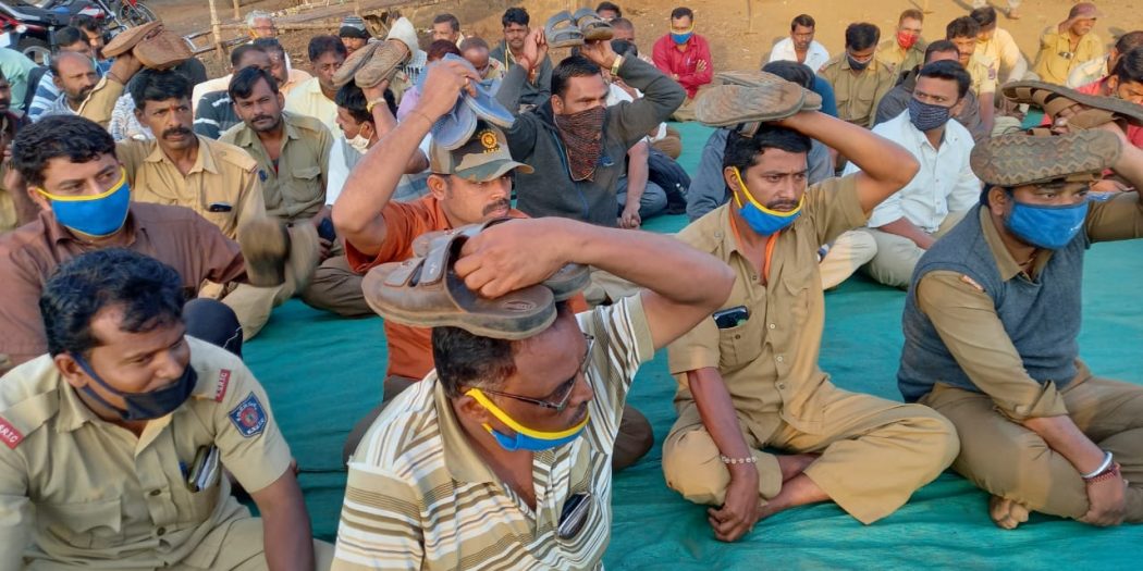 शनीवारी डोक्यावर चप्पल ठेऊन घेत घोषणाबाजी करत आंदोलनाची सुरुवात झाली आहे.राज्य सरकार आणि परिवहन मंत्री लक्ष्मण सवदी यांच्या विरोधात प्रचंड घोषणाबाजी करण्यात येत आहे.