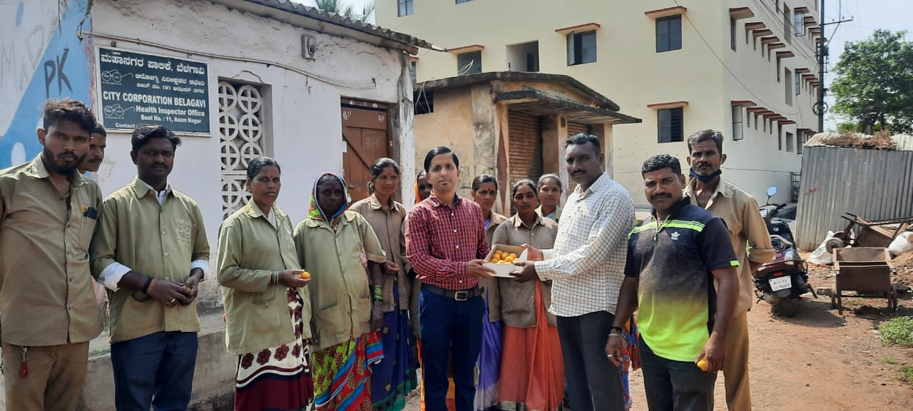 गुढीपाडव्यानिमित्त अभि नाईस कम्युनिकेशनचे मालक अभिजीत बेकवाडकर व सामाजिक कार्यकर्ते प्रसाद चौगुले यांनी आझमनगर, प्रभाग क्र. 25, बीट नंबर 11 येथील महापालिका सफाई कामगारांना मिठाई वाटली.