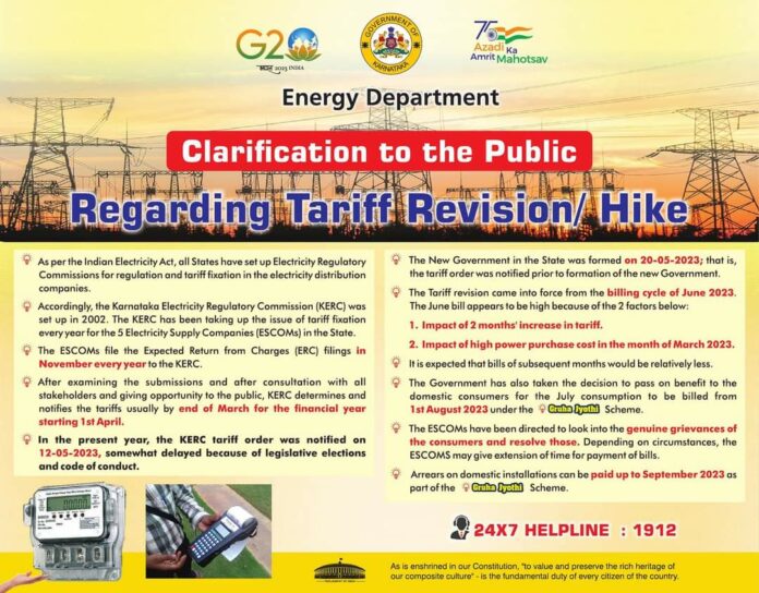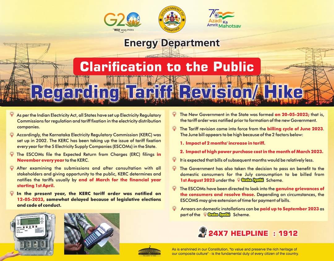तसेच ग्राहकांच्या वास्तवपूर्ण तक्रारींकडे गांभीर्याने लक्ष देऊन त्यांचे निवारण करावे अशी सूचना इस्कॉम्सला करण्यात आली आहे. याखेरीज घरगुती वीज ग्राहकांना आपल्या बिलाची थकबाकी गृहज्योती योजनेचा एक भाग म्हणून येत्या सप्टेंबर 2023 पर्यंत भरण्याची सूट असेल. या पद्धतीने राज्याच्या ऊर्जा खात्याने सध्याच्या वीज दर वाढीबाबत जाहीर खुलासा केला आहे.