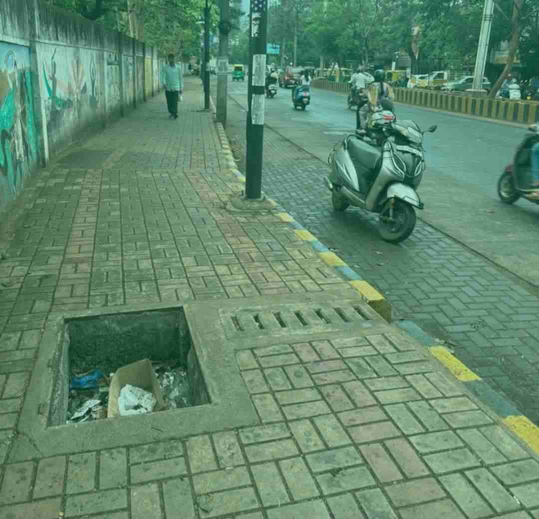 सध्या उघड्यावर असलेल्या या चेंबरमध्ये कचरा टाकण्यात आला असून रात्रीच्यावेळी फुटपाथवरून जाणाऱ्या पादचाऱ्यांचा अलगद तोल जाऊन अपघात घडण्याचीही शक्यता आहे. यामुळे संबंधित अधिकारी अथवा कंत्राटदाराने याकडे तातडीने लक्ष पुरवून तोडगा काढण्याची आवश्यकता आहे.