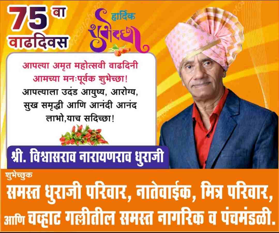 बेळगाव लाईव्ह : सामाजिक कार्यकर्ते आणि समाजसुधारक विश्वासराव नारायणराव धुराजी यांचा अमृत महोत्सव बुधवार दि. २९ मे रोजी कोनवाळ गल्ली येथील लोकमान्य रंगमंदिर (रिझ टॉकीज) येथे सायंकाळी ५.३० वाजता आयोजिण्यात आला आहे. २८ मे रोजी त्यांनी ७५ व्या वर्षात पदार्पण केले असून त्यांच्या अमृतमहोत्सवानिमित्त निवृत्त प्राचार्या विनोदिनी मुरकुटे यांनी त्यांच्या आजवरच्या कारकिर्दीचा घेतलेला आढावा…