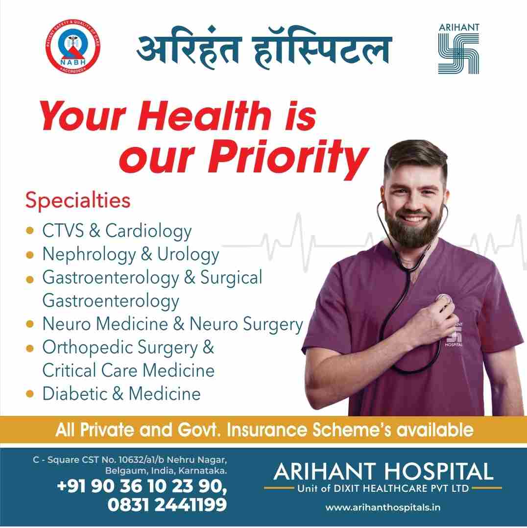 बेळगाव लाईव्ह : सर्व अत्याधुनिक वैद्यकीय सुविधांनीयुक्त नेहरू नगर बेळगाव येथील अरिहंत हॉस्पिटल येथे रुग्णांवर उच्च दर्जाचे आणि माफक दरात उपचार केले जातात. सर्व रुग्णांना अतिशय आनंददायक आणि तणावरहित वातावरणात उत्तम चिकित्सेची खात्री येथे दिली जाते.