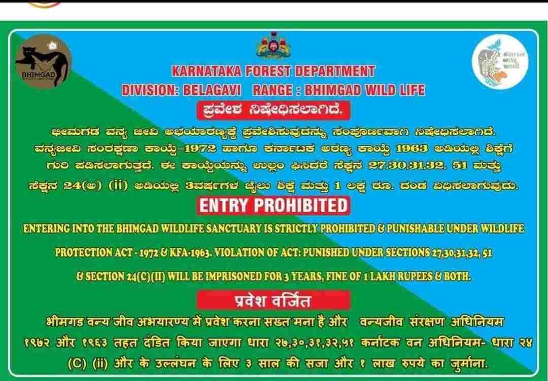 खानापूर (जि. बेळगाव) तालुक्यातील भीमगड वन्यजीव अभयारण्यात प्रवेश करण्यास सक्त मनाई आहे. वन्यजीव संरक्षण कायदा -1972 आणि केएफए -1963 नुसार तसे करणे दंडनीय आहे.