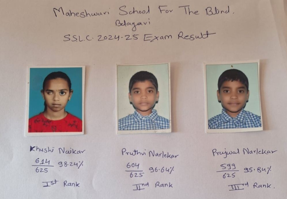 बेळगावमधील नेहरू नगर येथील महेश्वरी शाळा फॉर द ब्लाइंड या अंध विद्यार्थ्यांच्या शाळेचा दहावी निकाल नुकताच जाहीर झाला. यामध्ये 22 विद्यार्थ्यांनी परीक्षा दिली असून, त्यापैकी 20 विद्यार्थी उत्तीर्ण झाले आहेत. परीक्षेत एकंदर यशाचा टक्का अत्यंत समाधानकारक असून, अनेक विद्यार्थ्यांनी A+ आणि A ग्रेडमध्ये उत्तीर्ण होऊन गुणवत्तेची उंची गाठली आहे.