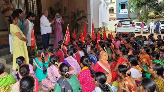 कर्नाटक राज्य ग्रामपंचायत कर्मचारी संघटनेच्या (सीटू) नेतृत्वाखाली आज सोमवारी सकाळी जिल्हा पंचायत कार्यालयावर काढण्यात आलेल्या मोर्चात जिल्ह्यातील स्वच्छ वाहिनी महिला कर्मचारी मोठ्या संख्येने सहभागी झाल्या होत्या. हातात कामगार संघटनेचे चिन्ह असलेला लाल बावटा हातात धरून न्यायाची मागणी करत आणि इन्कलाब जिंदाबादच्या घोषणा देत निघालेल्या या मोर्चाने साऱ्यांचे लक्ष वेधूले होते.
