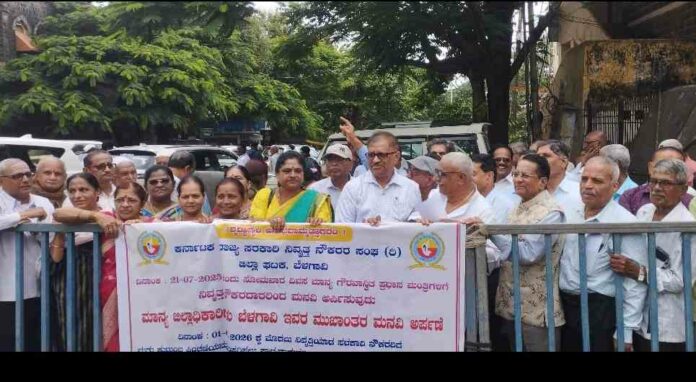 कर्नाटक राज्य सरकारी सेवानिवृत्त कर्मचारी संघटनेच्या बेळगाव जिल्हा शाखेतर्फे आज सोमवारी सकाळी जिल्हाधिकारी कार्यालयासमोर निदर्शने करून पंतप्रधानांच्या नावे असलेले उपरोक्त मागणीचे निवेदन जिल्हाधिकाऱ्यांना सादर करण्यात आले.
