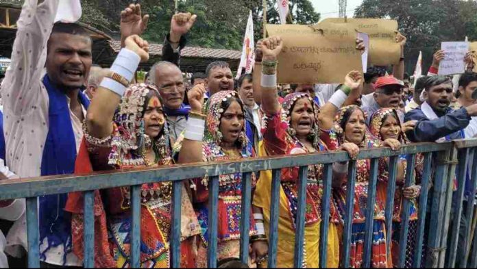बेळगाव लाईव्ह :अंतर्गत आरक्षण वाटपामध्ये 63 अनुसूचित जातींना न्याय किंवा पूर्वीप्रमाणे 17 टक्के आरक्षण द्यावे, अशी मागणी बेळगाव जिल्ह्यातील अंतर्गत आरक्षणामुळे अन्याय झालेल्या बंजारा, भोवी, कोरम, कोरट समाजाच्या संघटनेने मोर्चाद्वारे मुख्यमंत्री सिद्धरामय्या यांच्याकडे केली आहे.