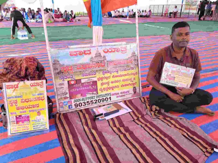 बेळगाव लाईव्ह : कर्नाटक विधिमंडळाच्या हिवाळी अधिवेशनाच्या आजच्या शेवटच्या दिवशी बागलकोट येथील नागराज कलगुटकर या व्यक्तीने भ्रष्टाचार मुक्त स्वच्छ विधानसभेसाठी छेडलेले एक दिवसाचे सांकेतिक आंदोलन काहीसे अलिप्त राहून देखील महत्त्वाचा संदेश देऊन गेले.