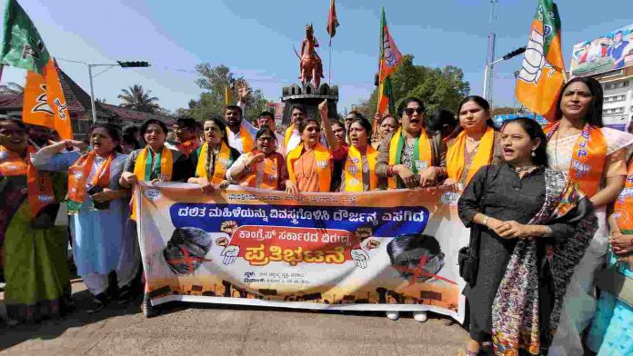 बेळगाव लाईव्ह :हुबळी येथे पोलिसांनी एका महिला भाजप कार्यकर्त्यावर हल्ला करून तिला विवस्त्र केल्याच्या निंद्य घटनेच्या निषेधार्थ बेळगाव जिल्हा भारतीय जनता पक्ष आणि भाजप महिला मोर्चातर्फे आज भव्य मोर्चा काढून पोलीस प्रशासन आणि राज्य सरकारचा धिक्कार करण्यात आला.