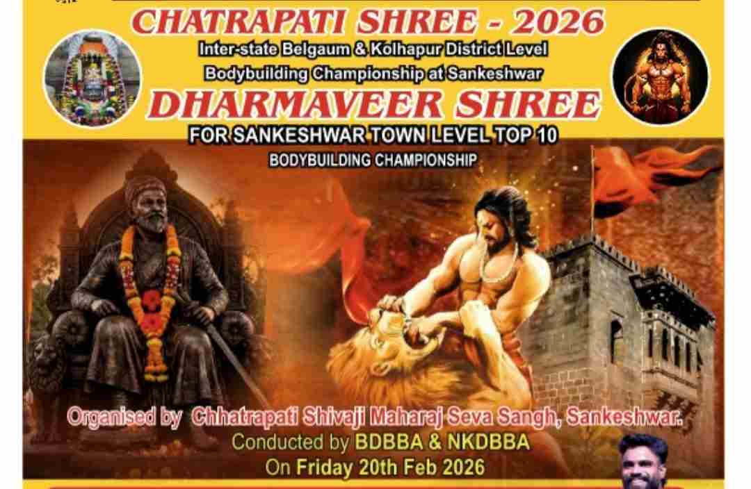 बेळगाव लाईव्ह :बेळगाव डिस्ट्रिक्ट बॉडी बिल्डर्स असोसिएशन (बीडीबीबीए) आणि एनकेडीबीबीए यांच्या संयुक्त विद्यमाने येत्या शुक्रवार दि. 20 फेब्रुवारी 2026 रोजी सायंकाळी 5 वाजता संकेश्वर (जि. बेळगाव) येथे ‘छत्रपती श्री -2026’ ही आंतरराज्य बेळगाव व कोल्हापूर जिल्हास्तरीय शरीर सौष्ठव स्पर्धा, तसेच ‘धर्मवीर श्री’ ही संकेश्वर गाव पातळीवरील टॉप -10 शरीर सौष्ठव स्पर्धा आयोजित करण्यात आली आहे.