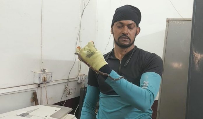 तेंव्हा लागलीच ग्रंथालयाकडे धाव घेतलेल्या आनंद यांनी स्वच्छतागृहाच्या दारावर अडकलेल्या सापाला शिताफीने अलगद पकडून आपल्या ताब्यात घेतले.