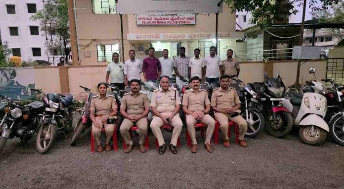 बेळगाव लाईव्ह :एका मोटरसायकल चोरी प्रकरणाचा यशस्वी छडा लावताना बेळगाव ग्रामीण पोलिसांनी काल तिघाजणांना अटक केली असून त्यांच्या जवळील 11,73,000 रुपये किमतीच्या एकूण 20 मोटरसायकली जप्त केल्या आहेत.